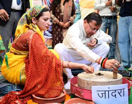 मुख्यमंत्री श्री पुष्कर सिंह धामी ने राजधानी देहरादून स्थित परेड ग्राउंड में आयोजित “सरकार के 4 साल बेमिसाल” कार्यक्रम के अंतर्गत विभागों द्वारा लगाए गए स्टॉलों का निरीक्षण किया। कृषि विभाग द्वारा लगाए गए परंपरागत आर्थिक कृषि गतिविधि स्टॉल का निरीक्षण के दौरान मुख्यमंत्री ने ग्रामीण महिलाओं के साथ सहभागिता करते हुए पारंपरिक कृषि एवं घरेलू उपकरण ओखली, सिलबट्टा एवं जांदरा भी चलाया। उन्होंने महिलाओं के साथ संवाद स्थापित कर उनके कार्यों की सराहना की तथा उनके योगदान को प्रदेश की अर्थव्यवस्था के लिए महत्वपूर्ण बताया। मुख्यमंत्री की इस सहभागिता से उपस्थित महिलाओं में उत्साह एवं आत्मविश्वास की झलक देखने को मिली।