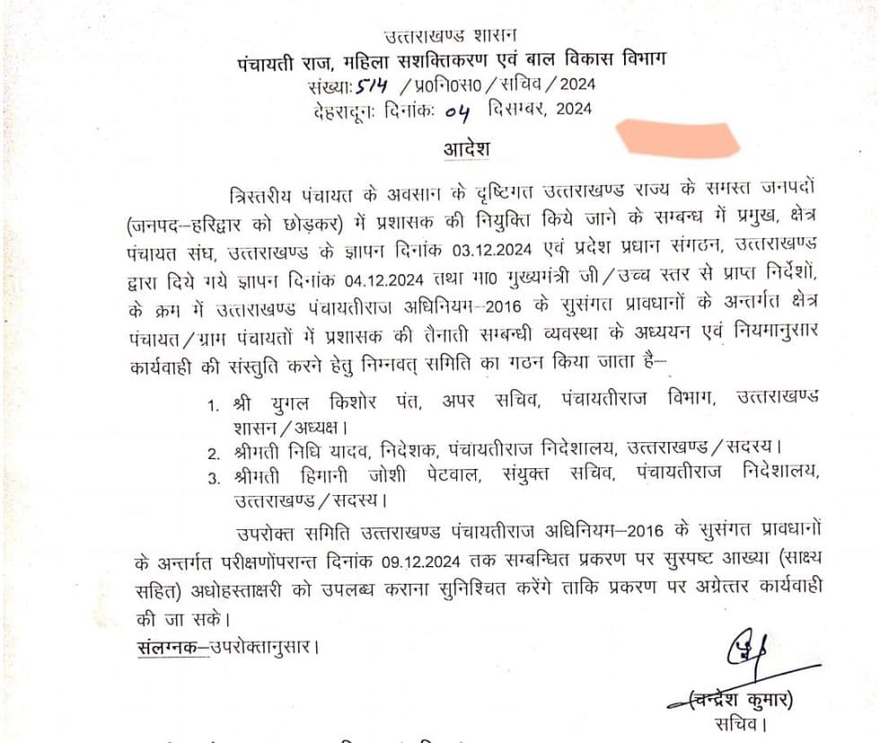 त्रिस्तरीय पंचायत के अवसान के दृष्टिगत उत्तराखण्ड राज्य के समस्त जनपदों (जनपद-हरिद्वार को छोड़कर) में प्रशासक की नियुक्ति किये जाने के सम्बन्ध में प्रमुख, क्षेत्र पंचायत संघ, उत्तराखण्ड के ज्ञापन दिनांक 03.12.2024 एवं प्रदेश प्रधान संगठन, उत्तराखण्ड द्वारा दिये गये ज्ञापन दिनांक 04.12.2024 तथा गा० गुख्यमंत्री जी / उच्च स्तर से प्राप्त निर्देशों, के क्रम में उत्तराखण्ड पंचायतीराज अधिनियम 2016 के सुसंगत प्रावधानों के अन्तर्गत क्षेत्र पंचायत/ ग्राम पंचायतों में प्रशासक की तैनाती सम्बन्धी व्यवस्था के अध्ययन एवं नियमानुसार कार्यवाही की संस्तुति करने हेतु निम्नवत् समिति का गठन किया जाता है-